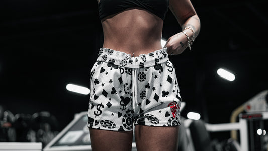 Goat Strength Casino Themed Mesh Gym Shorts - 5 inch inseam athletic shorts / graphic shorts w zipper pockets - Shorts with cards hearts poker chips