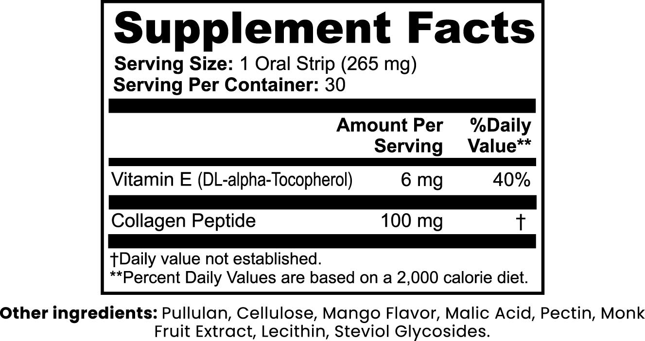 Ingredients: Collagen Peptide (100 mg), Vitamin E (DL-Alpha-Tocopherol) (6 mg), Pullulan, Cellulose, Lecithin, Mango Flavor, Malic Acid, Pectin, Monk Fruit Extract, Steviol Glycosides
