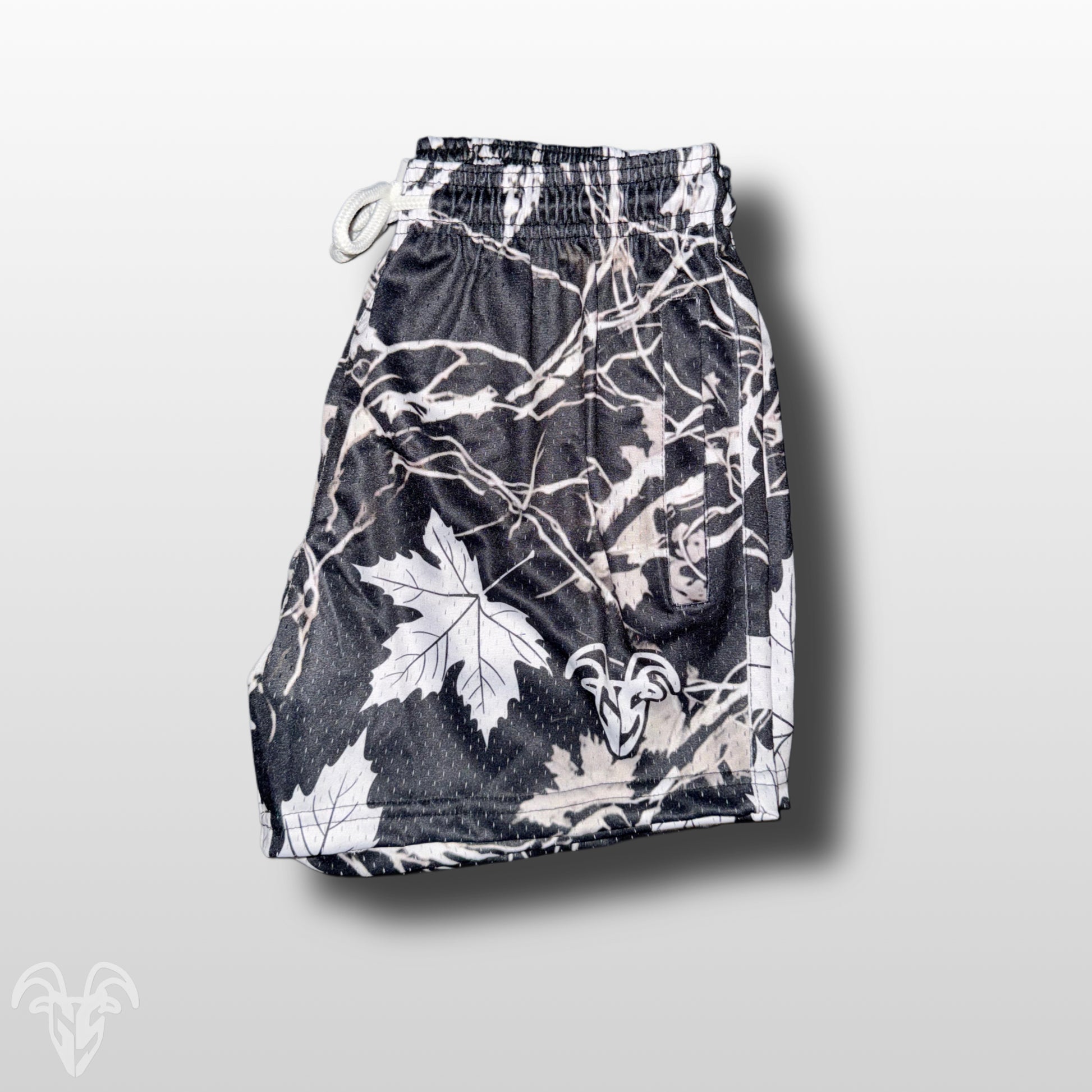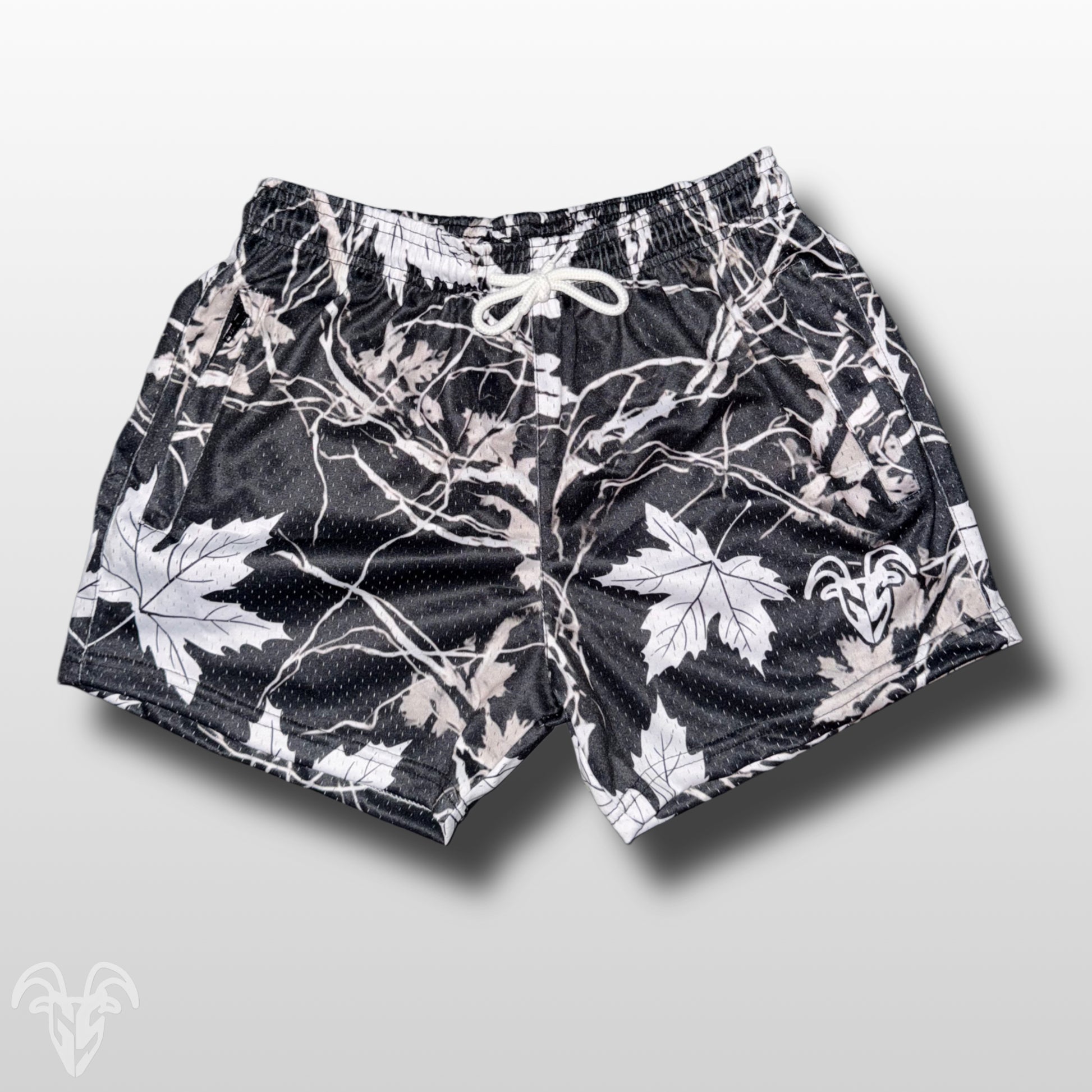 Black and White Maple Camo Goat Strength Mesh Gym Shorts - 5 inch inseam shorts- Zipper Pockets