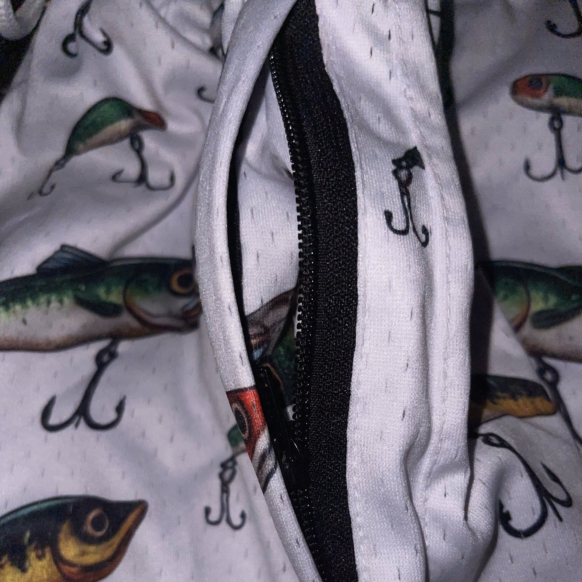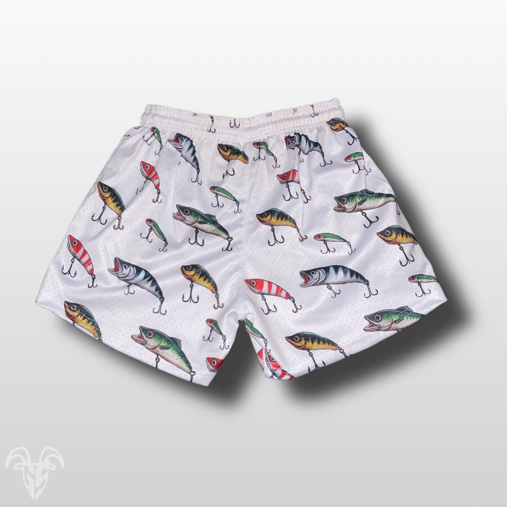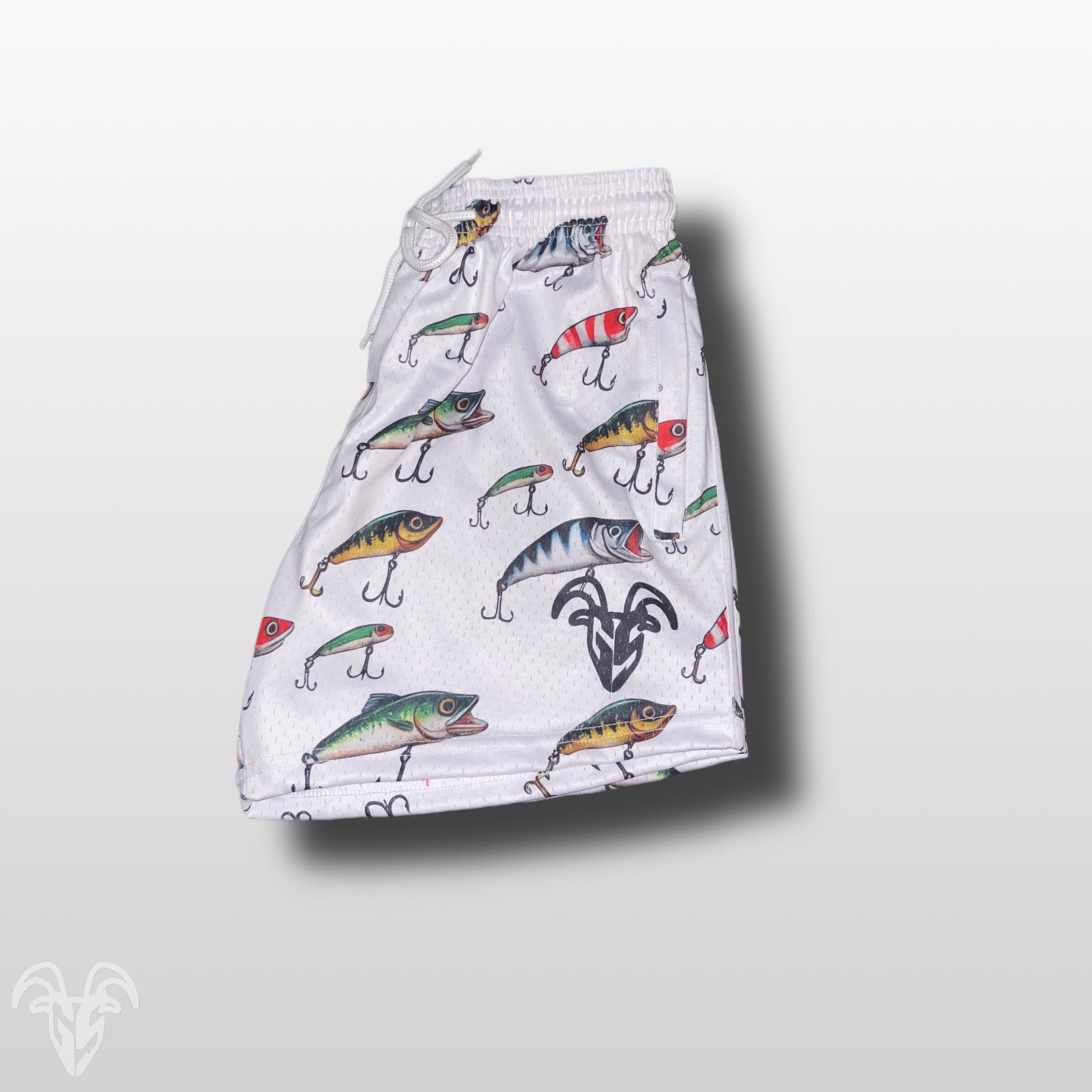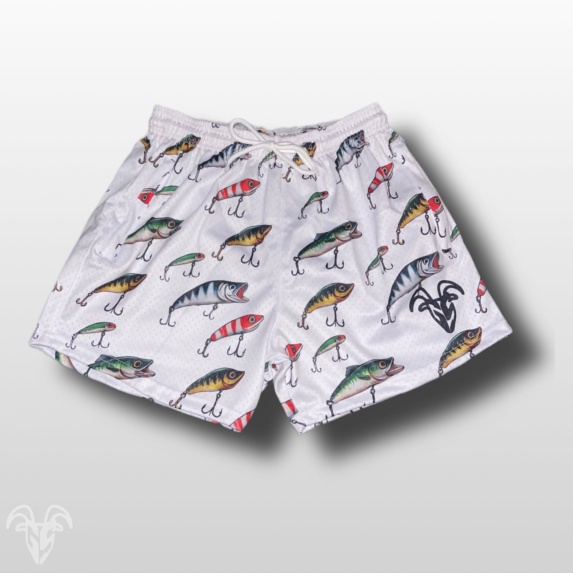 Goat Strength - Men’s 5 inch inseam shorts - Mesh athletic Fishing design shorts - Fishing lure design shorts - Zipper pockets - Men's Shorts