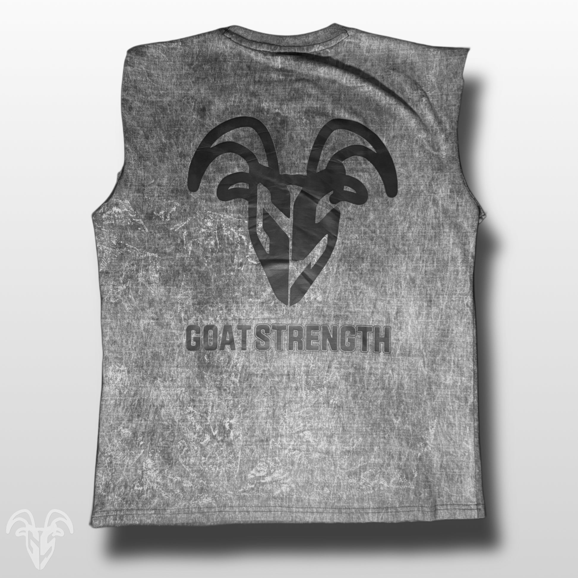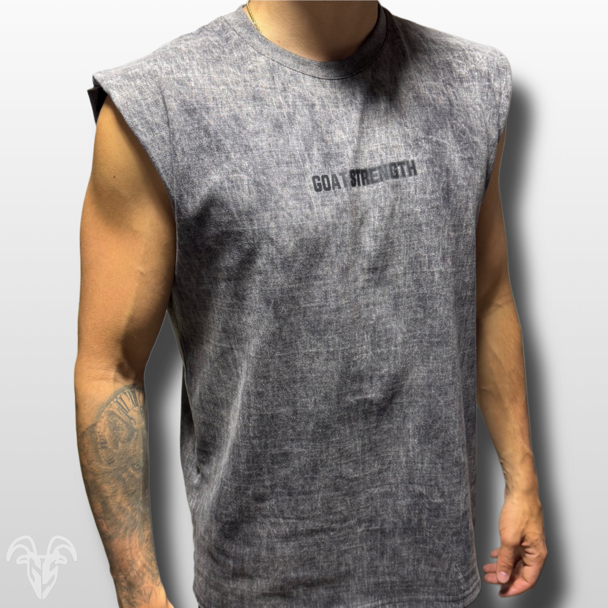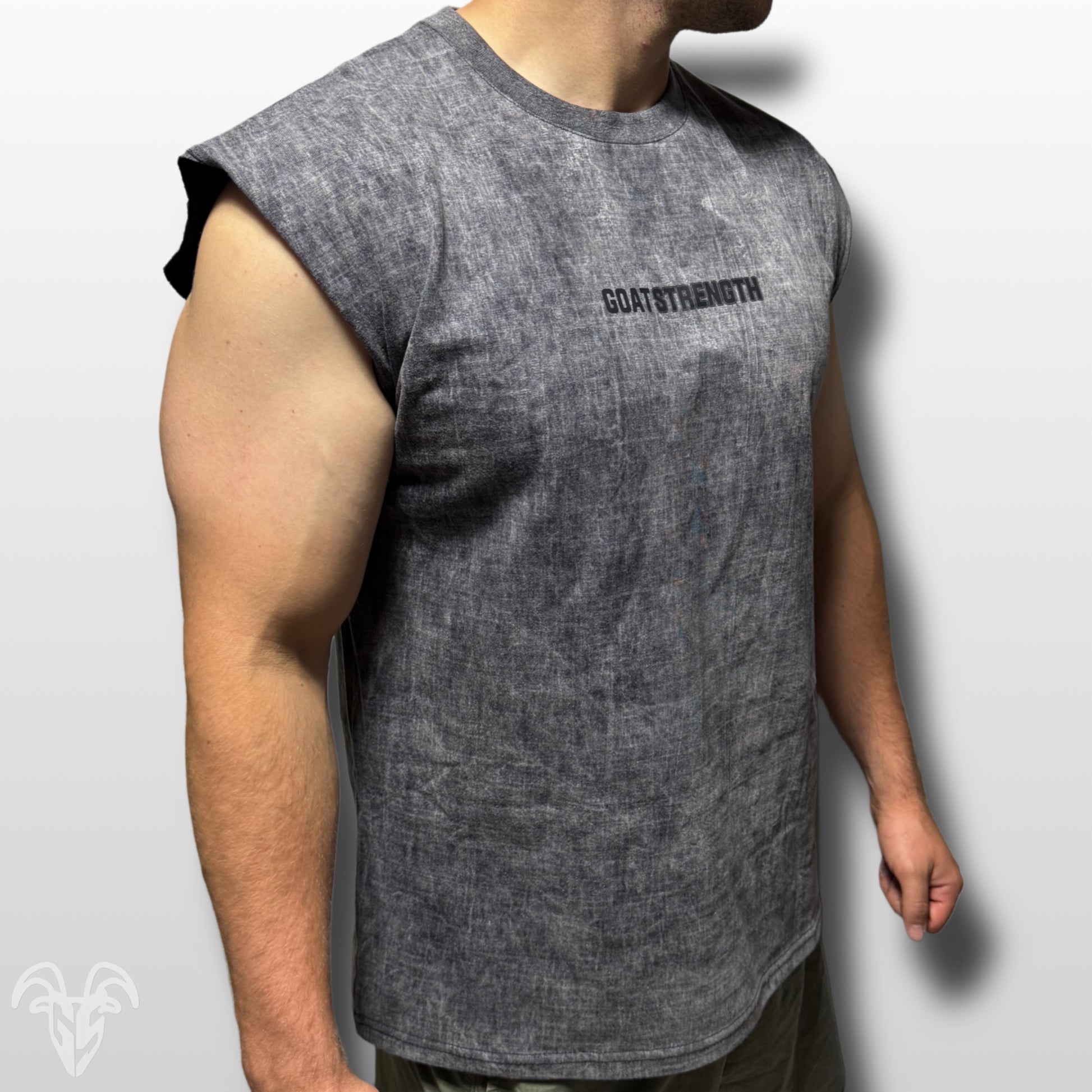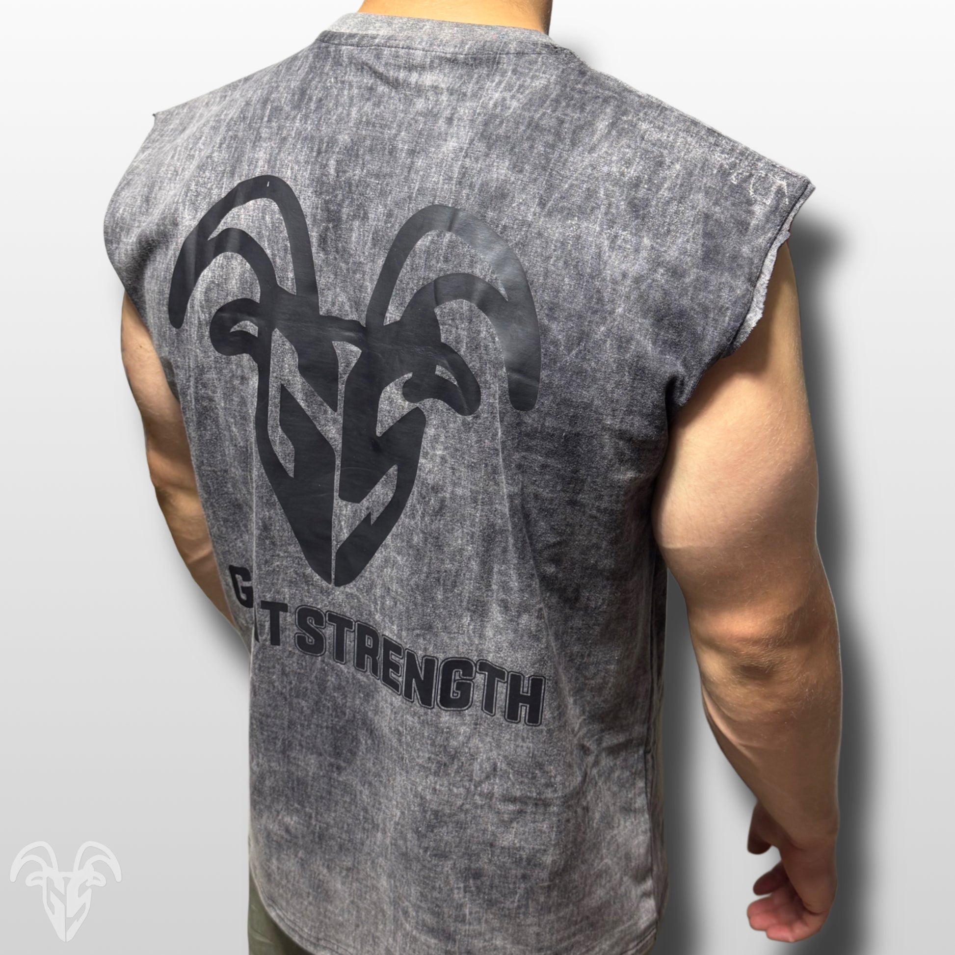 Goat Strength Black & White Washed Cotton Cutoff - Premium Quality Tank Top T-Shirt for Casual Wear & Athletic Activities - Gym Pump Cover with over the shoulder Acid Wash Tank Cut-Off