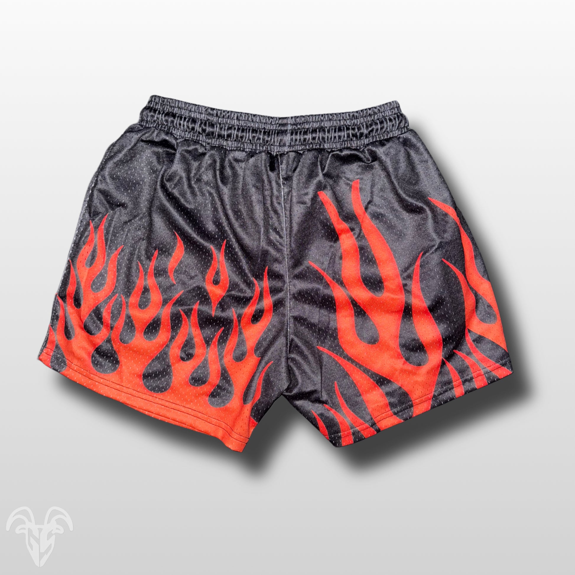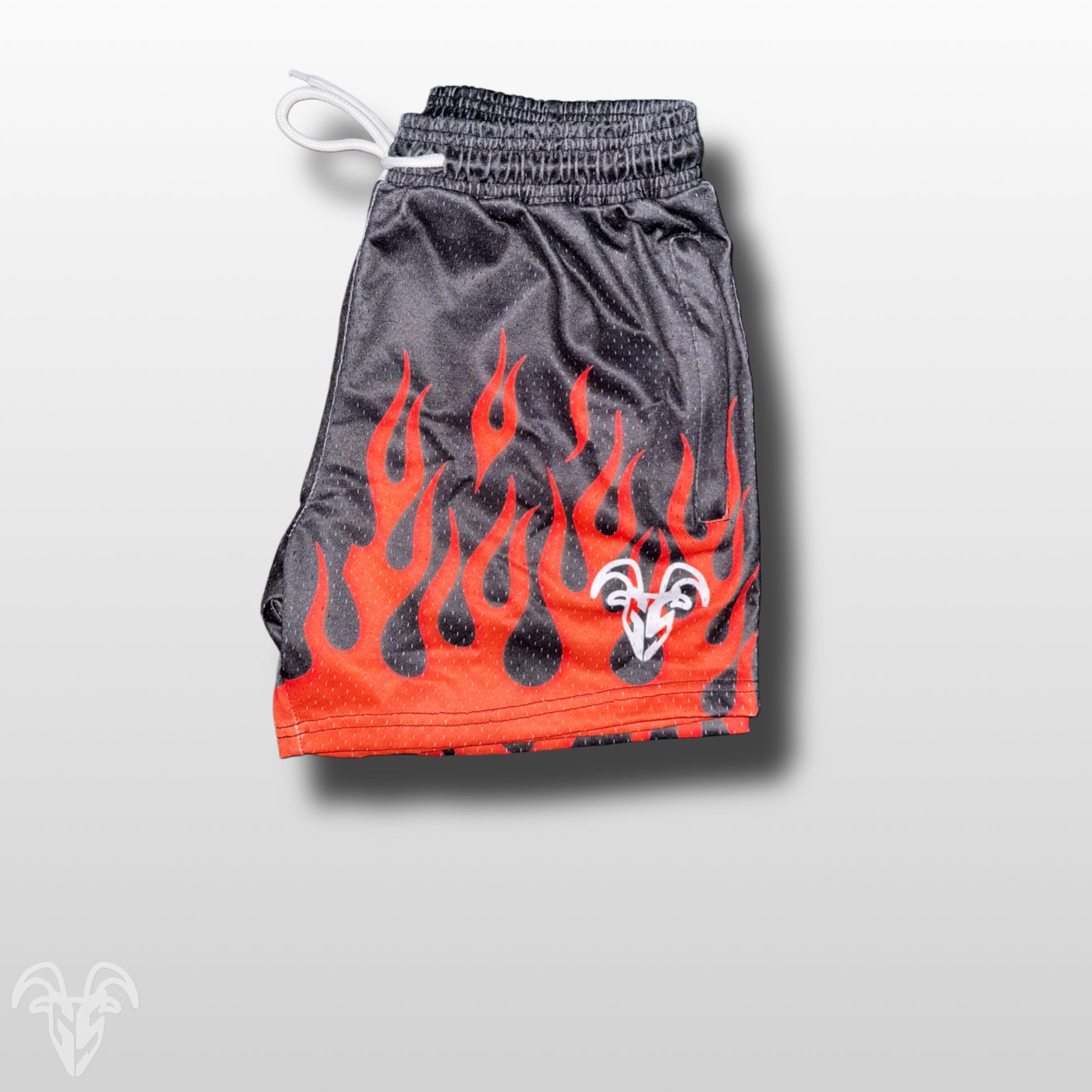 Goat Strength 5" Inseam Mesh Shorts - Black with Orange Flame Themed Design - Athletic stretchy material breathable for workouts or just casual wear