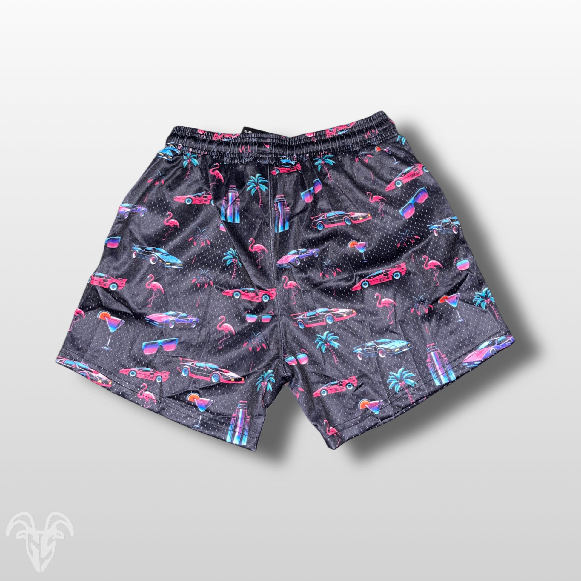 Goat Strength 5" Inseam Mesh Shorts - Miami Vice Themed Design - Athletic stretchy material breathable for workouts or just casual wear