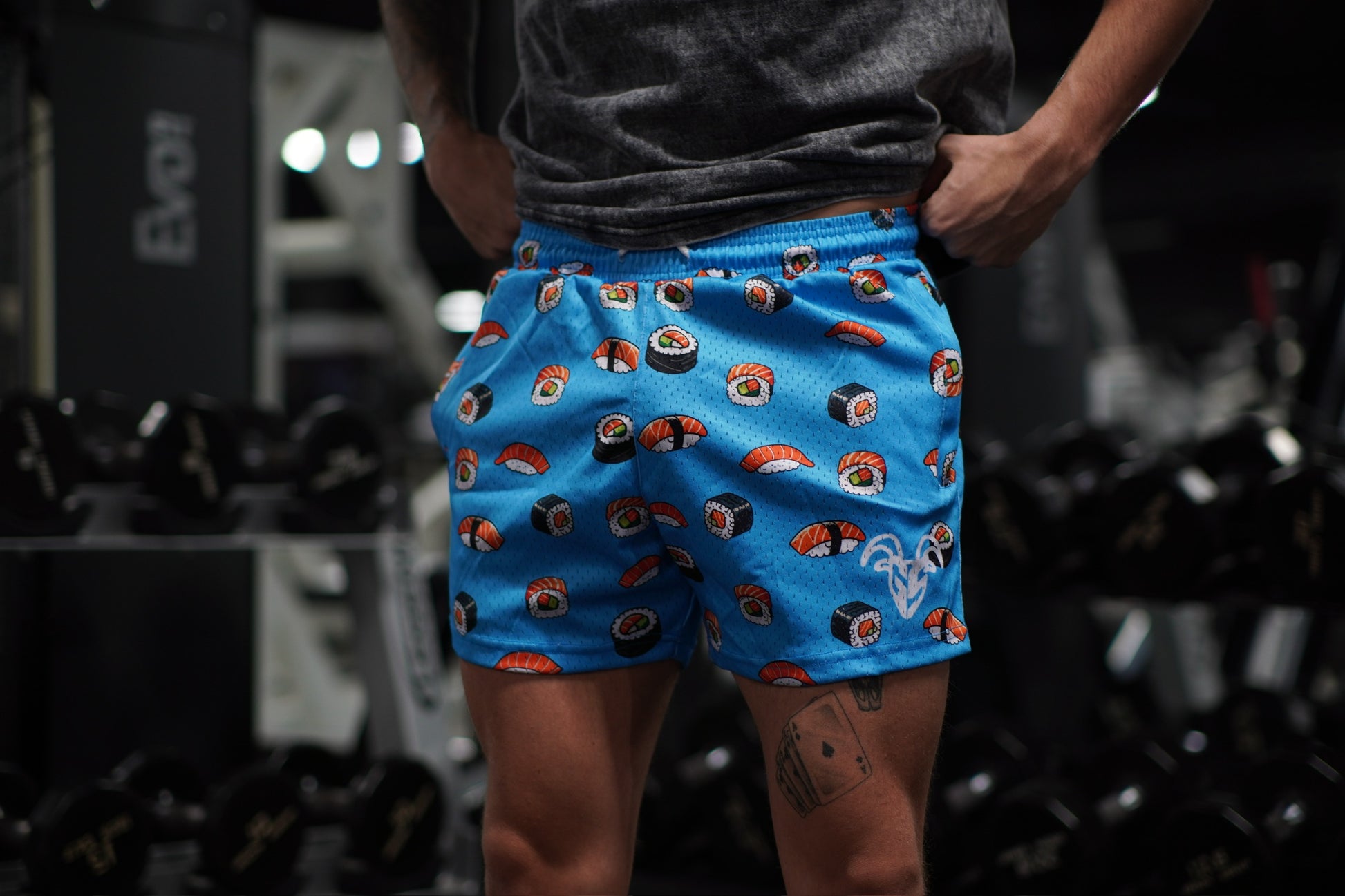 Goat Strength 5" Inseam Mesh Shorts - Sushi Themed Design - Athletic stretchy material breathable for workouts or just casual wear