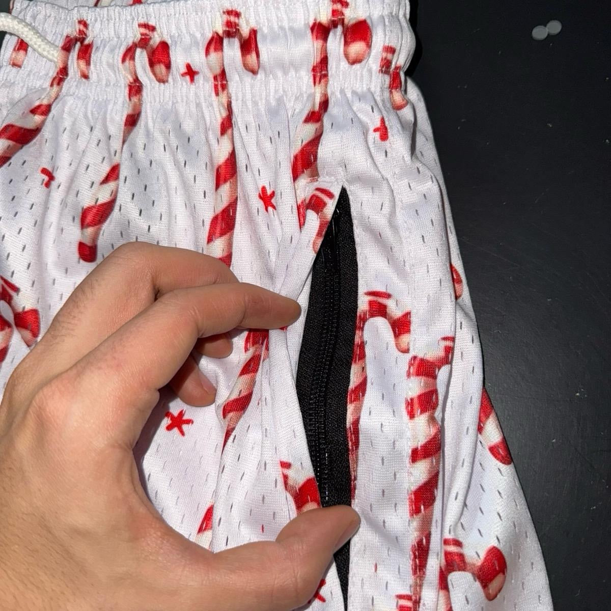 Goat Strength Christmas Candy Cane Mesh Shorts – Holiday 5” Inseam Athletic Shorts with Zipper Pockets