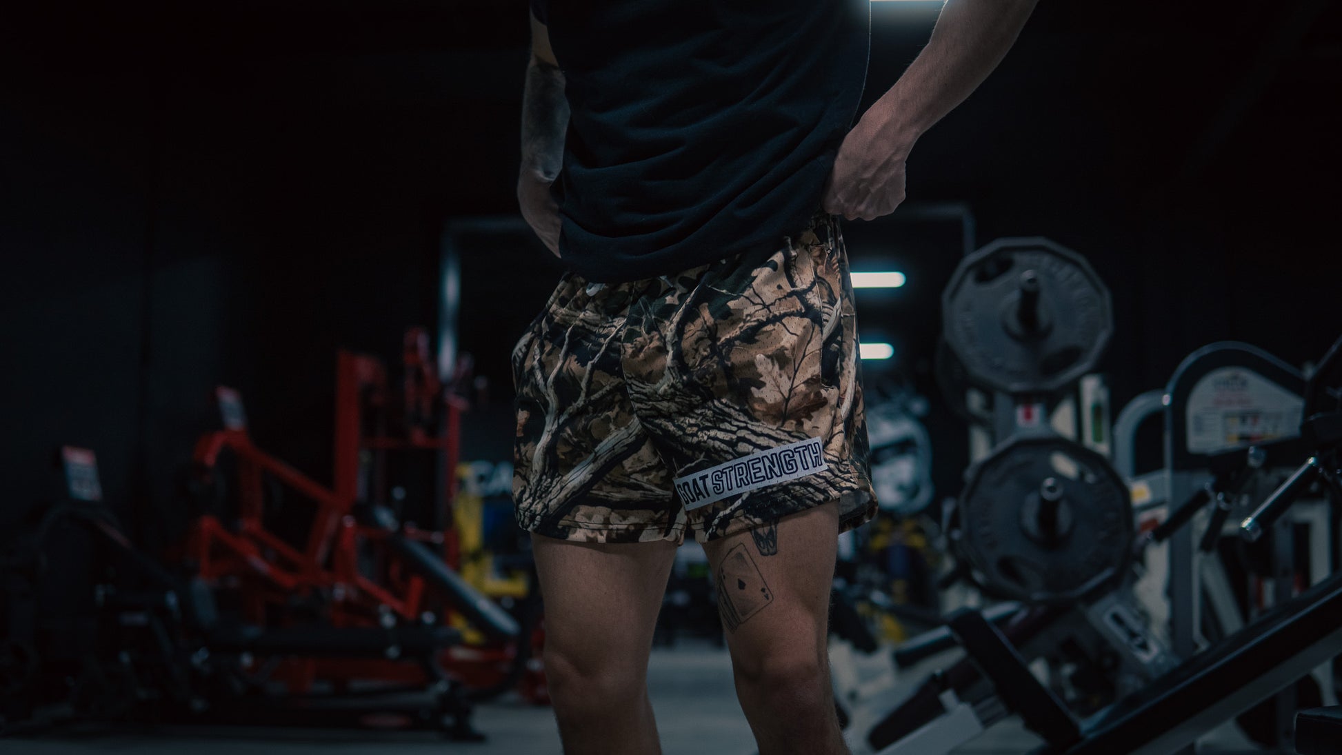 Goat Strength - Men’s 5 inch inseam shorts - Mesh athletic Alternate Logo Hunter Camo Shorts - Zipper pockets - Men's Shorts