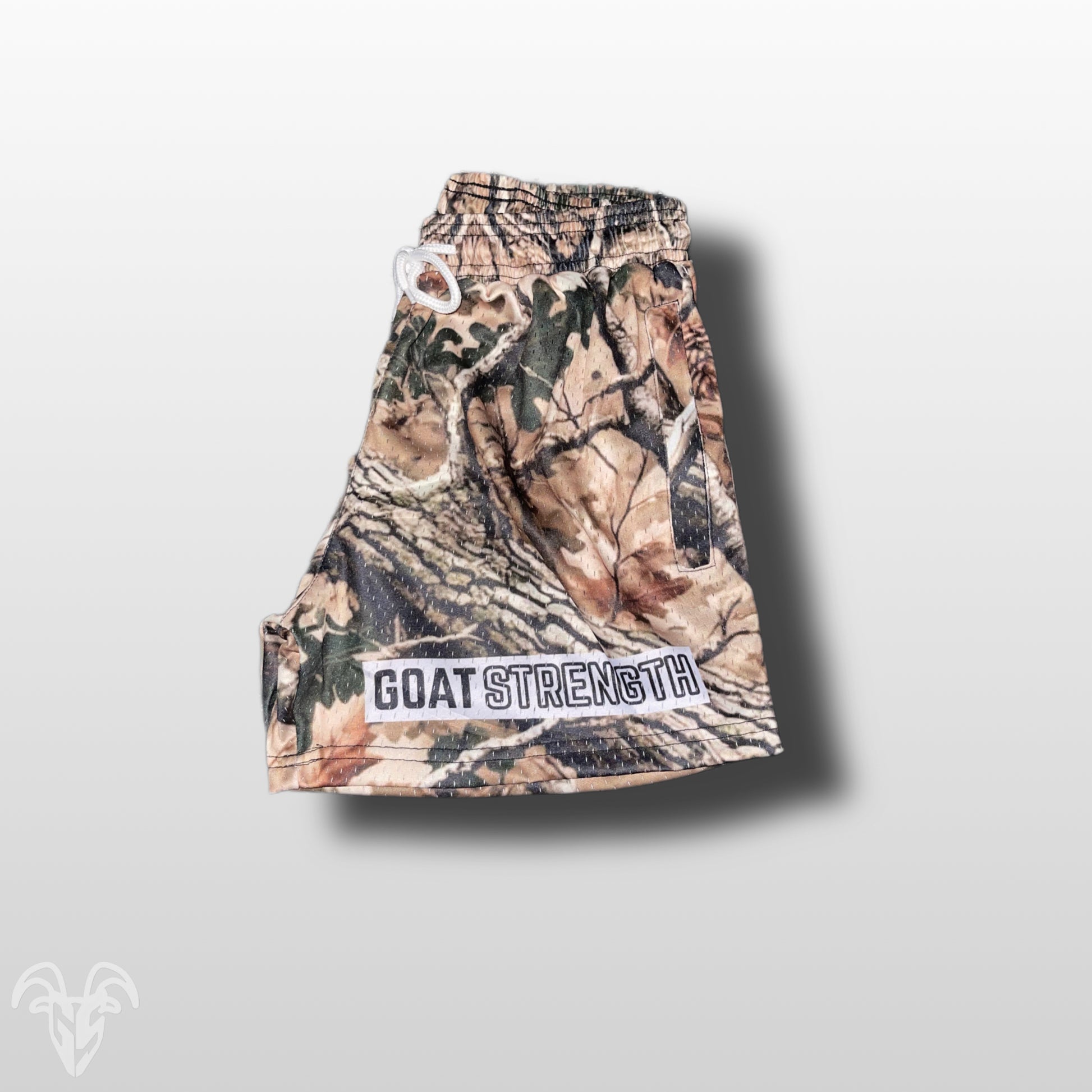 Gear up with the Goat Strength Alternate Logo Hunter Camo Patterned Athletic Mesh Shorts and experience the perfect blend of style, comfort, and durability!